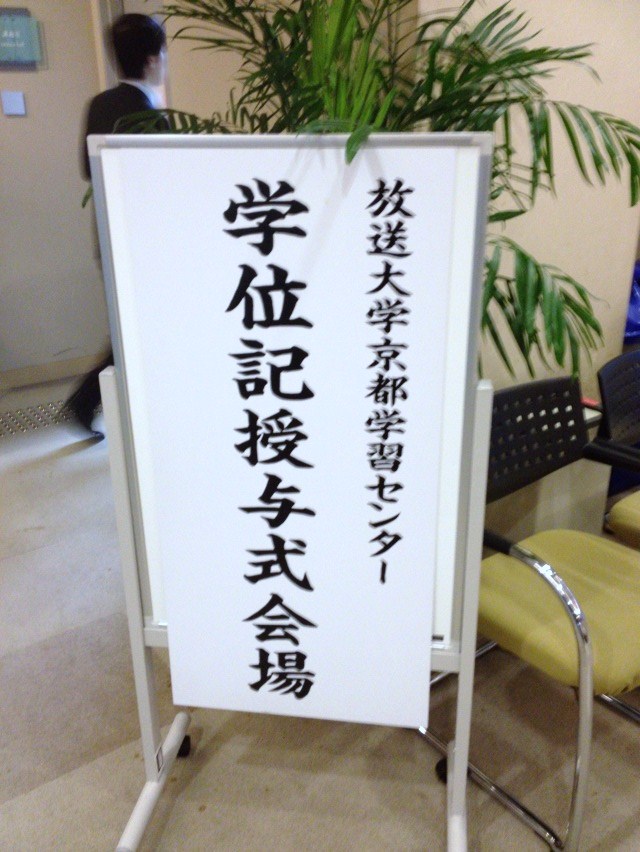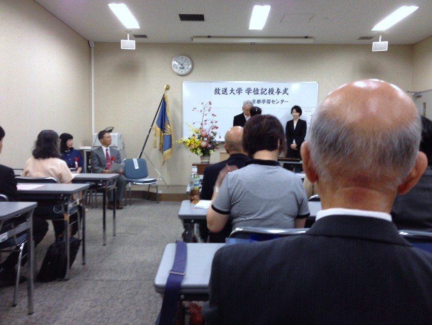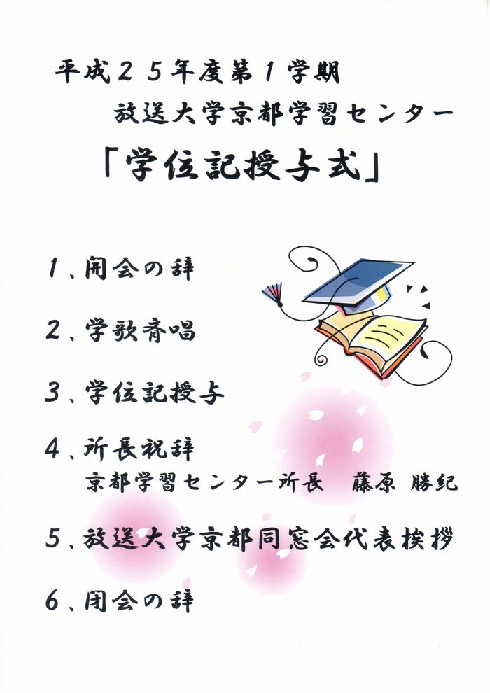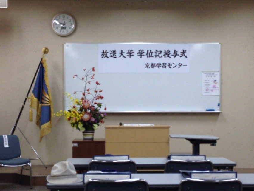 平成25年度第1学期放送大学京都学習センター学位記授与式が開催された。受付は9時30分からであったが、9時30分を見計らって会場となる講義室に足を向けると、既に受付は始まっていた。受付では学生証が回収される。9月中に学習センターを利用する予定がある旨を申し出れば、学生証は返却してもらえるようだが、どうせ新しい学生証の交付を受けるときに回収されるのだから、素直に提出しておく。同時に京都同窓会主催の祝賀懇親会の会費3,000円を徴収された。