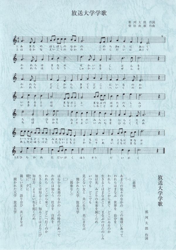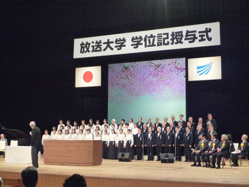 最後は学歌斉唱である。今度は演奏ではなく、紛れもなく斉唱であり、檀上にも放送大学学園本部同窓会千葉学習センター・神奈川学習センター合唱団が並ぶ。指揮は2年前と同じく岡部学長だ。