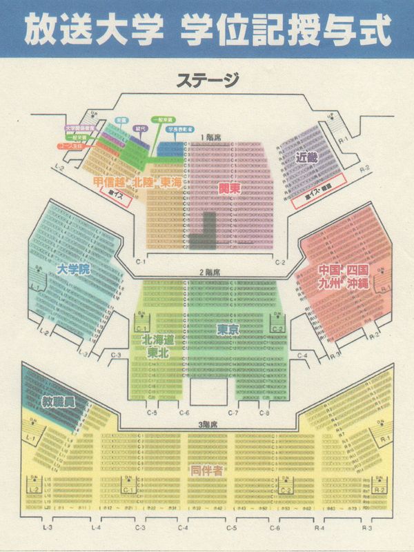 近畿地区の学生は、前回と同様にステージに向かって前方右端の一角が指定される。出席者の多い関東地区の学生がステージ正面席となっているが、なんとなく関東優遇のきらいがある。正面中央席が空席ばかりでは、見栄えの問題もあるだろうが、わざわざ地方から上京してくる学生にも配慮して、正面の席を割り当ててあげてもよさそうなものだ。