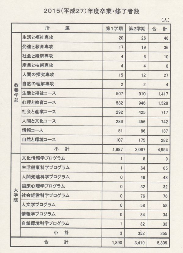卒業証書・学位記授与では、平成27年度教養学部卒業生が4,954名と発表される。心理と教育コースが1,528名で最も卒業生が多く、続く生活と福祉コースが1,582名、人間と文化コースが742名と半数以下となり、社会と産業コースが717名、自然と環境コースは282名、情報コースが137名、その他旧専攻の卒業生が131名という内訳である。今年度の卒業生代表は心理と教育コースを修了した学生であった。
