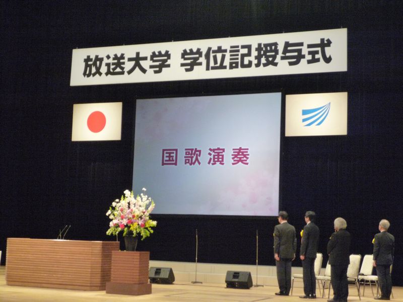 開式の辞に続いて、国家演奏が始まる。昨今の「君が代」斉唱問題に配慮してか、国家演奏という形式をとっているが、放送大学の学位記授与式においては、事実上の君が代斉唱となっており、会場内には君が代を斉唱する学生の声が響き渡る。続く来賓紹介であるが、今年度の学位記授与式にも大臣の姿はなく、文部科学省は大臣政務官、総務省は大臣官房審議官の出席であった。