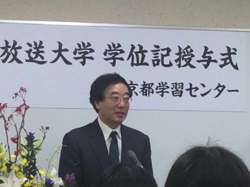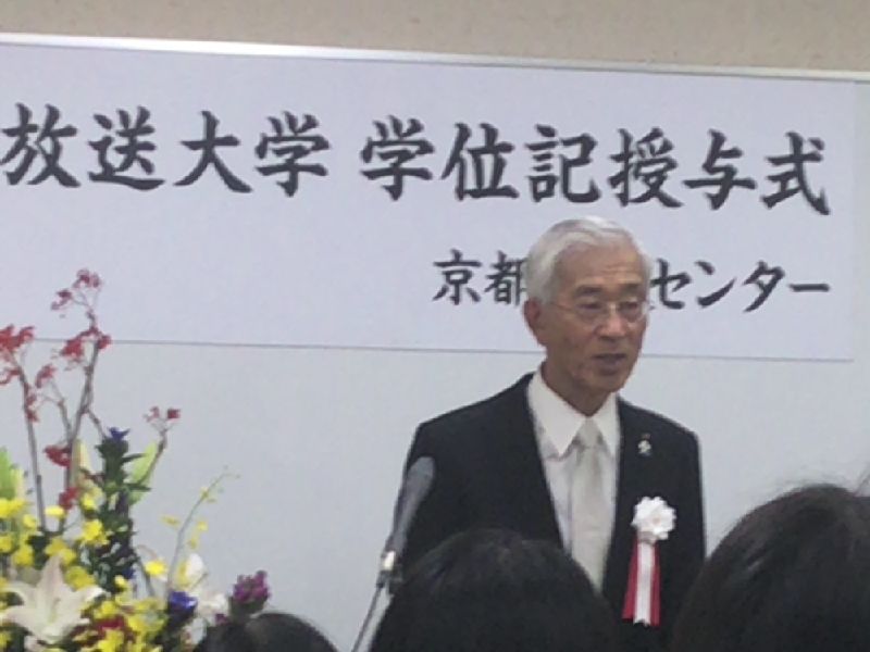 続いて出席者25名一人一人に京都学習センター江﨑信芳所長から、学位記が手渡される。通常は、2人目以降は「以下同文」で済ませるのであるが、江﨑所長は全員にすべての文面を読み上げていた。些細なことではあるが、すべてを読み上げるのは大変な労力を要するし、江﨑所長の卒業生に対する敬意が感じられる。学位記には、今年の4月に就任した來生新学長の署名があった。