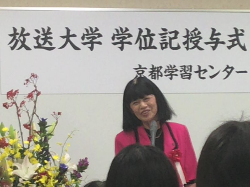 例年と比較すると来賓の多い学位記授与式で、その後、佐久間正幸先生、西克治先生、船橋新太郎先生と、日ごろから京都学習センターで面接授業や特別講義、学習相談などを受け持っておられる先生方の挨拶が続き、津野和子放送大学同窓会連合会会長の挨拶で締められた。学位記授与式の終了後は、恒例の記念撮影が行われ、懇親会会場への移動となる。