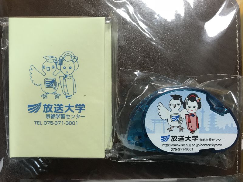 座席には卒業記念品が用意されており、今回はクリアファイル、付箋、三色ボールペン、修正テープ、マウスパッドであった。すべてのグッズに放送大学の放送大学京都学習センターの文字が入っており、京都学習センターが用意したオリジナルグッズであることが分かる。放送大学イメージキャラクターである「まなぴー」のイラストの隣に舞妓のイラストが添えてあるのも京都らしい。