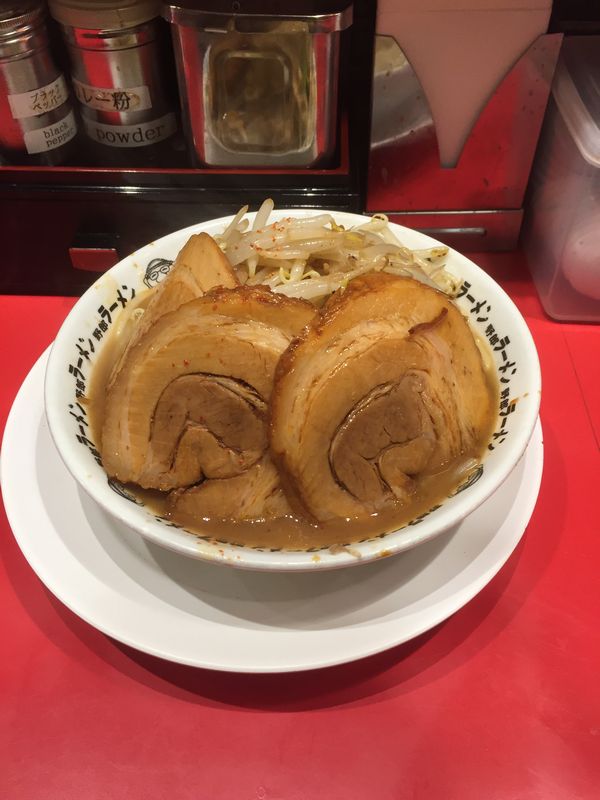しっかりと炒めた野菜が盛り付けられ、大きな厚切りチャーシューが3枚並んだ。麺は太麺で、野菜、チャーシュー、麺の3点セットでガッツリ食べさせる趣向のようだ。ノーマルでも食べ応え十分で、朝昼兼用のブランチどころか、朝昼晩兼用の食事となった。
