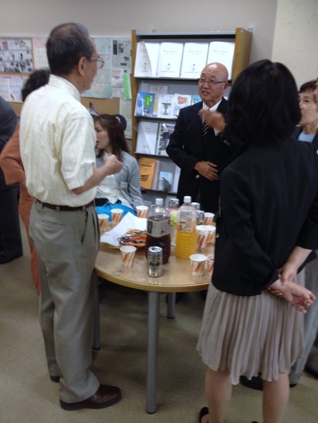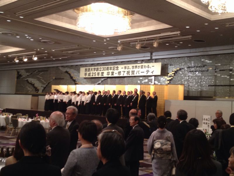 パーティは立食形式で、テーブルは地域ごとに指定されている。滋賀・京都・奈良の学習センターが同じテーブルになっていた。15分ほど遅れてようやく開会。再び岡部学長の指揮で学歌斉唱となった。引き続き主催者挨拶として、学長と連合会会長の挨拶があり、理事長の挨拶の後、乾杯。