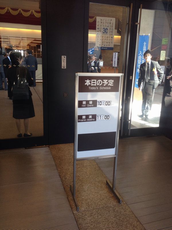 地域別の受付を済ませて会場内へ入る。もちろん近畿地区では一番乗りであった。座席は地域ごとにブロックが指定されており、近畿はステージに向かって右前方の1階席となっていた。最初は最前列に陣取ってみたが、ステージを少し見上げるような感じになり、1時間もステージを見上げていたら首が痛くなりそうだ。5列目ぐらいがステージと同じ高さぐらいであったが、早くから並んで後方に座るのももったいない気がして3列目に陣取ることにした。