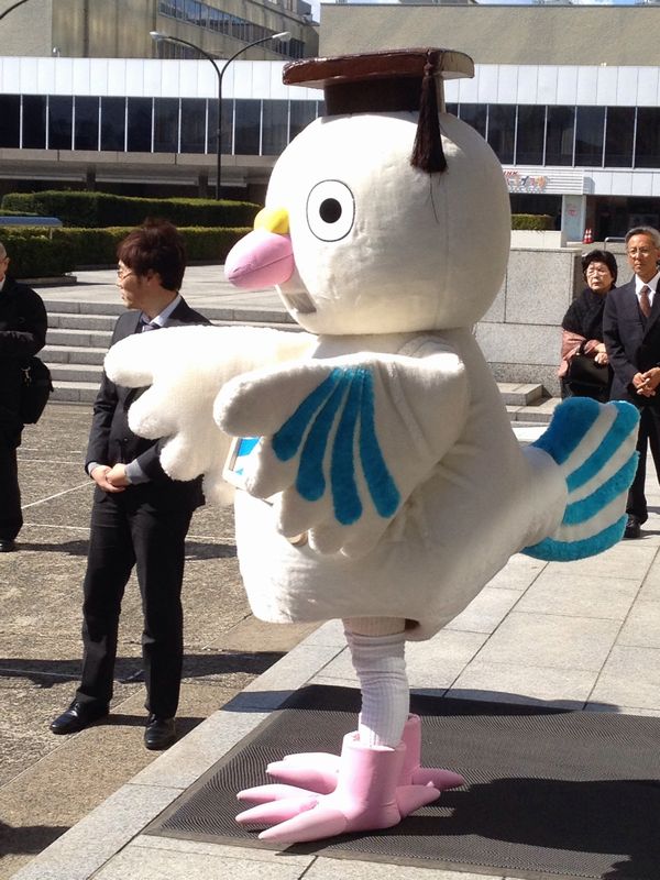 せっかく早く着いたので、それならば一番乗りしてやろうと、正面玄関のドア前に陣取る。隣にやってきたのは岐阜からのお婆さんで、開場の瞬間をとらえようとするカメラを意識して、身なりを整えていた。「変な格好で写ってしまったら、孫に怒られますから!」とのこと。周囲を見回すと、いつの間にか「まなぴー」が登場し、記念撮影のために引っ張りだこになっていた。ゆるキャラコンテストに出場しても、組織票が固いので、かなり上位に食い込むのではなかろうか。