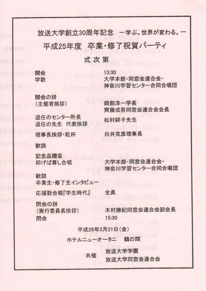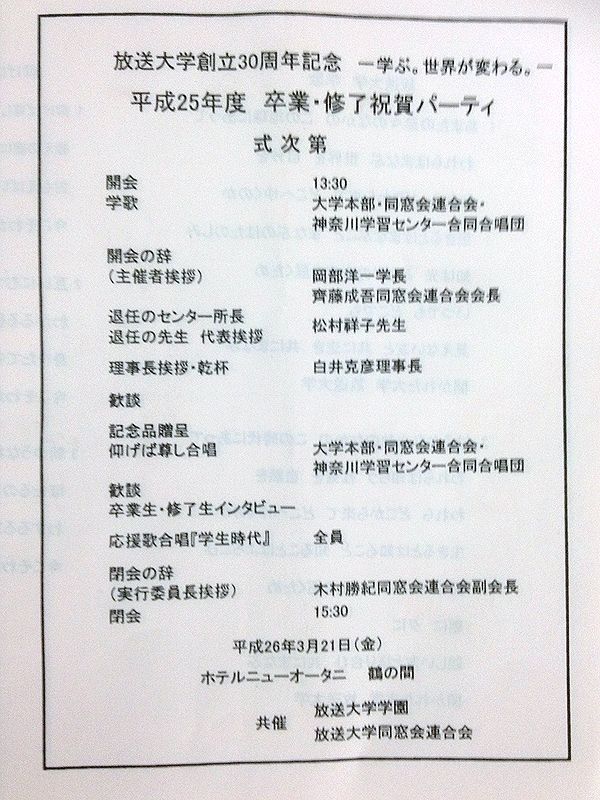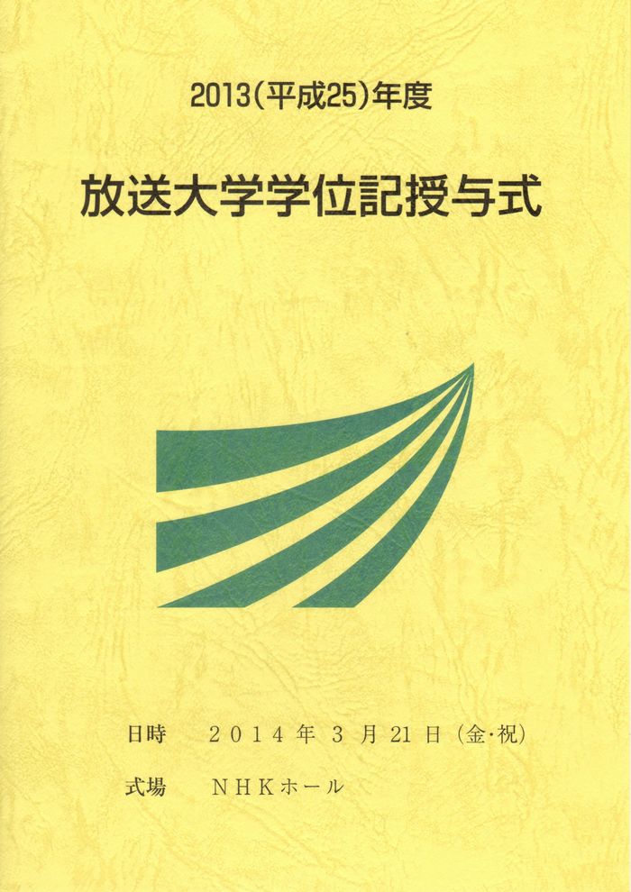 「2013(平成25)年度放送大学学位記授与式等の御案内」と「平成25年度「卒業・修了祝賀パーティ」のご案内」が届いた。既に9月に京都学習センターの学位記授与式には出席し、学位記も手にしているが、全国一斉の学位記授与式は、9月卒業生と3月卒業生の合同で3月に実施する。場所は例年と同じNHKホールとなっている。関東近郊の学生以外はなかなか出席しにくいと思うが、今年は3連休の初日となっているので、地方からの出席者も多いのではないかと予想する。文部科学省が設置している大学なので、来賓には文部科学大臣が出席するのも特徴だ。