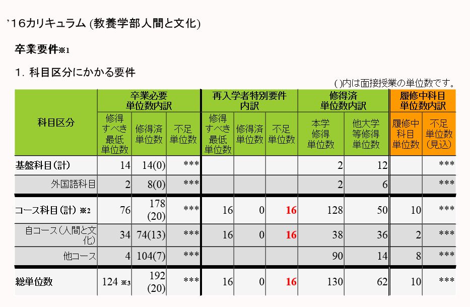 まずは、現在所属している心理と教育コースで比較する。履修中の科目を履修済みと仮定して、現カリキュラムでは、専門科目が12単位の不足。新カリキュラムでは、コース科目が12単位の不足になる。ただし、現カリキュラムでは、人間と文化コースに移行する予定であるため、今学期履修中の4単位はクリアされてしまい、不足単位数は16単位となる。