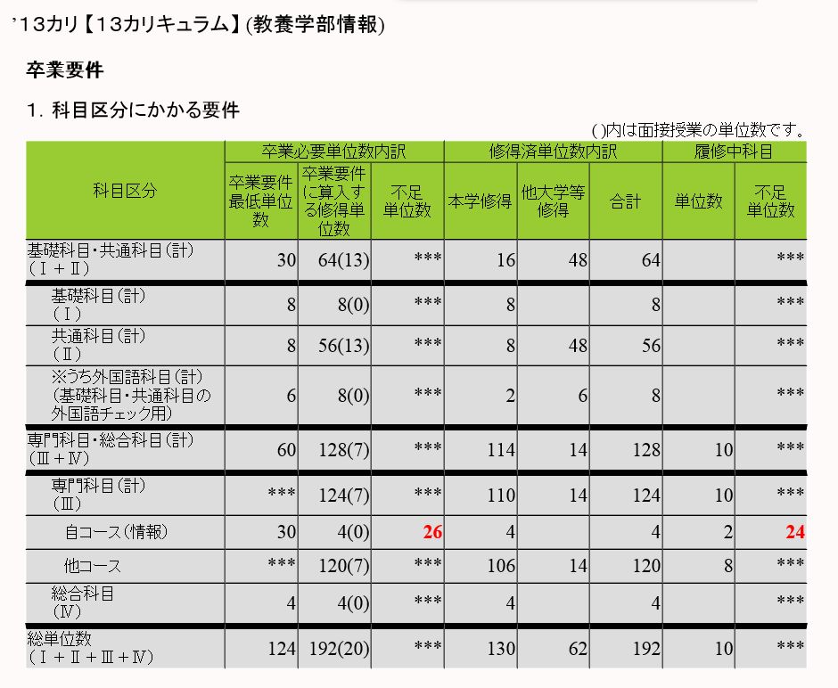 最も履修単位の少ない情報コースで比較すると、履修中の科目を履修済みと仮定して、現カリキュラムでは、専門科目が24単位の不足。新カリキュラムでは、コース科目が16単位の不足になる。差し引きで8単位の負担軽減という結果になった。これは、他大学の履修単位や放送大学での履修済み単位が、無造作に自コースで単位認定された結果であるが、果たしてこのような認定で本当に良いのかと一抹の不安は残る。数年後に再びカリキュラムの改正が行われるのではなかろうか。