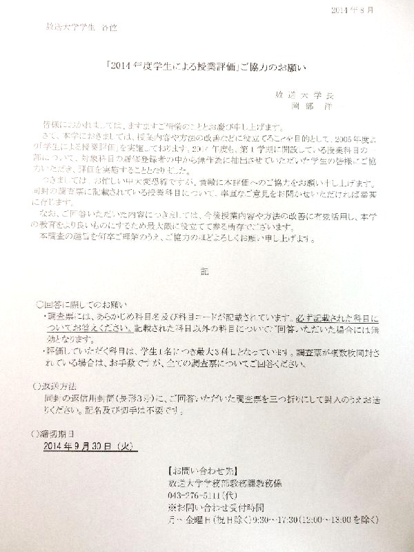 放送大学から「2014年度学生による授業評価」の依頼があった。新設科目を履修している学生に対して無作為抽出によって依頼を行っているとのこと。今学期は、「和歌文学の世界(’14)」と「アジアの社会福祉と国際協力(’14)」が新設科目であるが、授業評価の依頼があったのは、「アジアの社会福祉と国際協力(’14)」のみであった。締切期日は9月30日までとなっている。