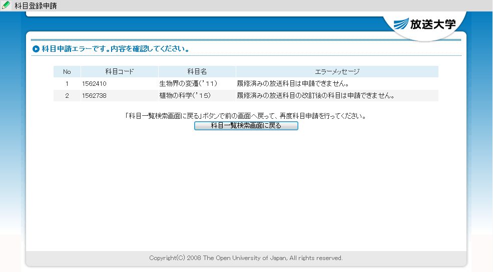 まずは、気になる自然と環境コースの専門科目である「生物界の変遷(’11)」と「植物の科学(’15)」の履修登録を試してみる。画面に異なるエラーメッセージが表示されたので、一瞬、どちらかの科目を落としたのかとドキリとしたが、よくよくエラーメッセージを確認すると、「生物界の変遷(’11)」は、「履修済みの放送科目は申請できません。」という定番のエラーメッセージ。もう一方の「植物の科学(’15)」は、「履修済みの放送科目の改訂後の科目は申請できません。」というものであった。「植物の科学(’09)」は、本年度で閉講となるため、本来であれば裏技による合否確認はできない。しかし、後継科目の「植物の科学(’15)」は、「植物の科学(’09)」の履修済み学生に履修を認めていないため、裏技が可能となっている。エラーメッセージが異なるのも、改訂後の科目である「植物の科学(’15)」の履修登録を行ったことによる影響に過ぎなかった。