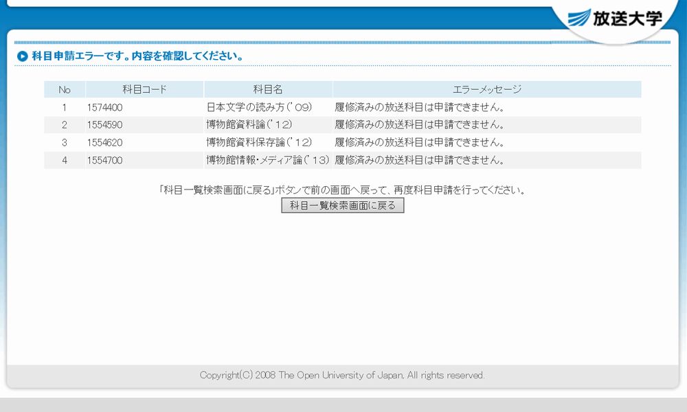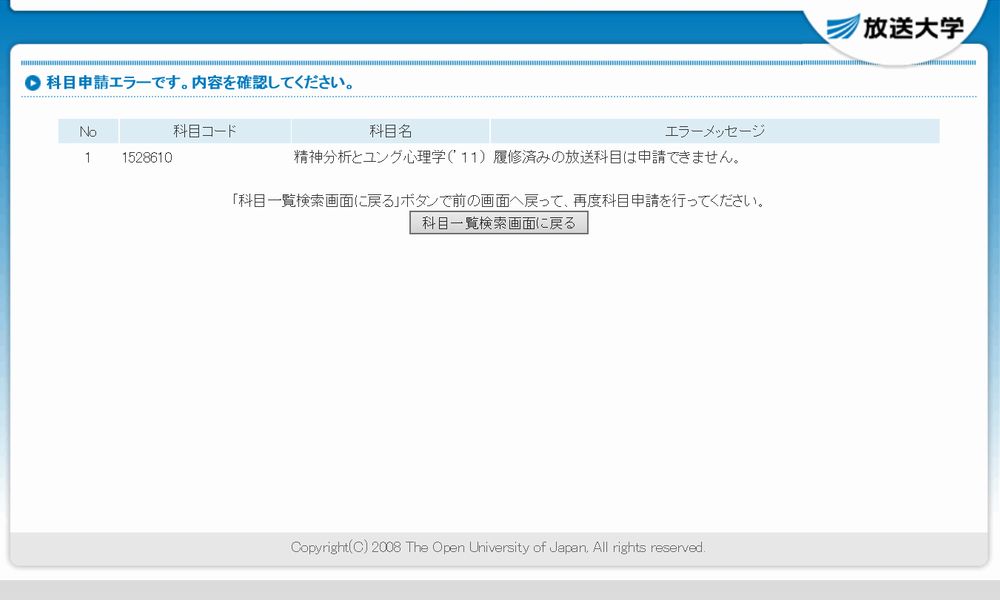 「精神分析とユング心理学(’11)」が合格していれば、残りの科目はまったく問題ないのであるが、試しに裏技で確認すると、いずれの科目も「履修済みの放送科目は申請できません。」という定番のエラーメッセージが表示され安泰。心置きなく2学期の履修登録を行うことができそうだ。