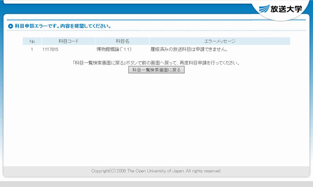 裏技で履修状況を確認してみると、今回履修した8科目のすべてにおいて、無事に、「履修済みの放送科目は申請できません。」との表示が出た。とりあえず、すべて合格のようなので安心する。正式な成績発表は8月20日の予定である。