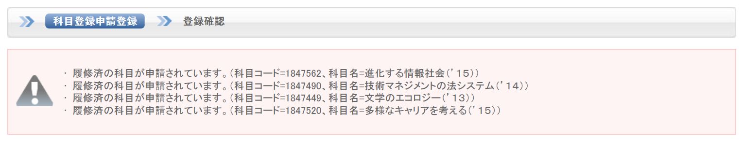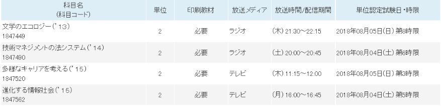 今回単位認定試験を受験した4科目の履修登録を試みると、無事に「履修済みの放送科目は申請できません。」という表示がされた。正式な成績発表は、平成30年8月22日(水)の予定である。