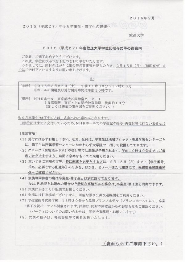 放送大学から平成27年度学位記授与式の案内が届いた。今年度は3月26日(土)の午前11時からの開催となっている。場所は定番のNHKホールである。私は9月卒業生のため、既に京都学習センターの学位記授与式に出席し、学位記も手にしているが、大学全体での学位記授与式は3月にしか開催されないので、9月卒業生も出席することが認められている。NHKホールでの学位記授与式には2年前にも出席しているので、わざわざ東京に出向く必要もないのであるが、節目であるので、今回も学割夜行バスを利用した0泊3日(2車中泊)の強行軍での参加を計画している。どうせなら、3月19日(土)の開催にしてもらえれば、3連休でゆとりのある日程となったのだが、会場の都合であろうと推察する。学位記授与式をNHKホールで行うことは、放送大学のステイタスみたいなものなので、会場を優先すれば、日程に融通が利かなくなる。案内には出欠確認の郵便はがきが同封されており、2月15日(月)の消印有効となっている。