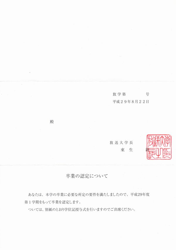 放送大学から來生新学長名義で「卒業の認定について」という通知が届いた。これで正式に3度目の卒業が放送大学に認められたことになる。