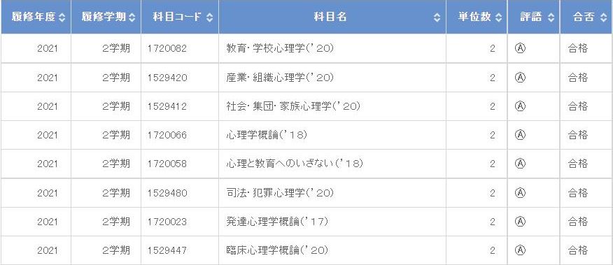 8科目16単位を無事に確保し、心理と教育コースの卒業要件の単位数をクリアした。後は在籍要件を満たすだけで無事に卒業が確定する。残り1年半、何もせずに過ごすか、追加で履修をするか悩ましいところである。