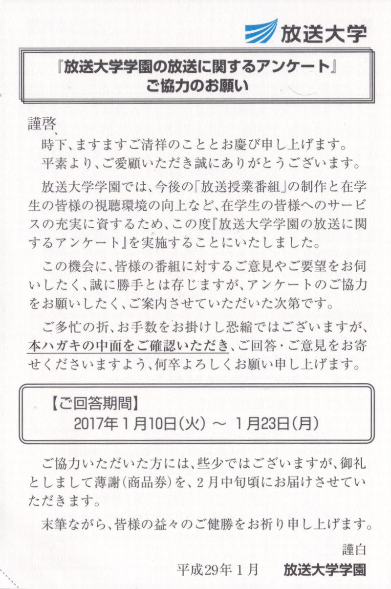 未だに届く年賀状に紛れて、「『放送大学学園の放送に関するアンケート』ご協力のお願い」と題した圧着ハガキが届いた。ハガキを開くとWEBページのURL、ID、パスワードが記載されている。これまでの授業アンケートとは大きく装いが異なり、「本調査にご協力いただいた方には、些少ではございますが、御礼としまして薄謝(商品券)を、2月中旬頃にお届けさせていただきます。」と記載されている。これまで放送大学のアンケートで薄謝などを贈呈されたことはなかったので驚きである。