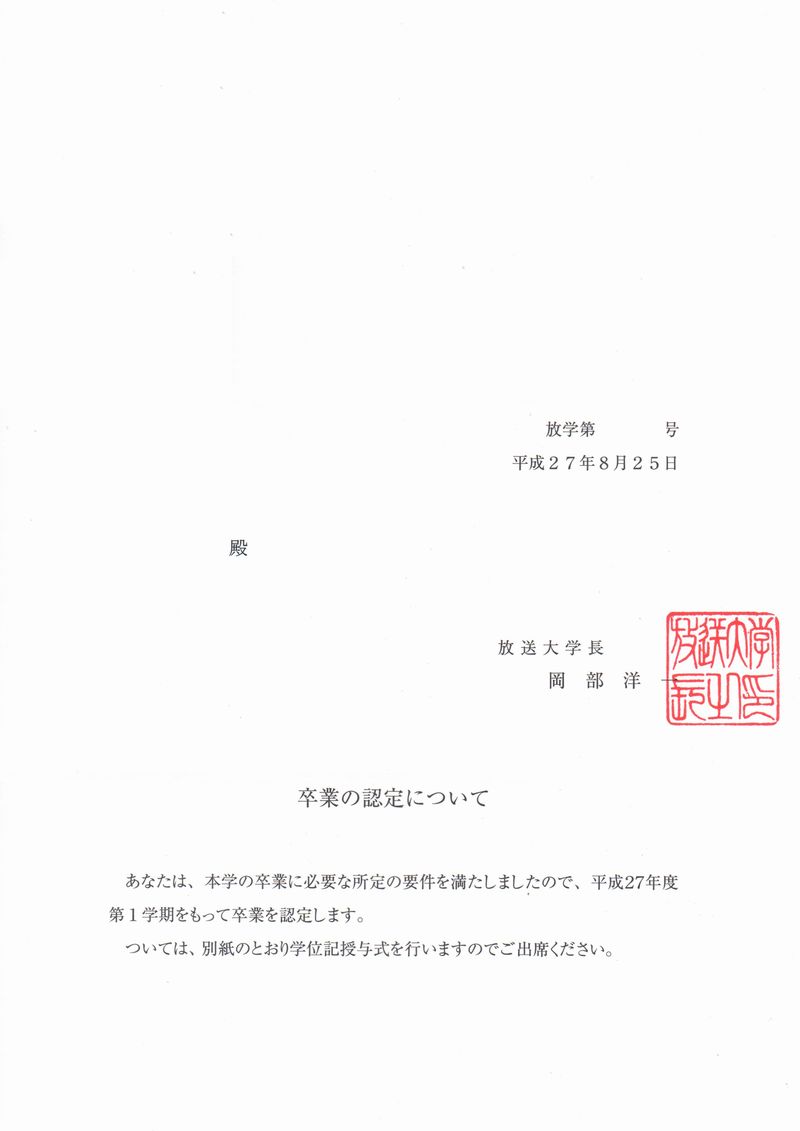放送大学から岡部洋一学長名義で「卒業の認定について」という通知が届いた。これで正式に2度目の卒業が放送大学に認められたことになる。第1学期は、本部主催の学位記授与式は開催されず、各学習センター及びサテライトスぺースでの実施となる。もっとも、平成28年3月26日(土)にNHKホールで開催される本部主催の学位記授与式には、第1学期の卒業生も出席することが可能である。